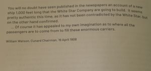 Each part is introduced by its own section, differentiated by a black strip running down the page.  They are populated by quotes from the various chapters which give a flavour of the material. They have been chosen to support the narrative and are from material which is either rare or previously unpublished.  One example is a quote included in the introduction to Part 1, which is from William Watson, Cunard’s chairman, writing in April 1908.  He discussed a number of issues at that time and commented on recent press reports claiming (inaccurately) that the White Star Line were going to built a new 1,000-foot liner.  The potential implication he saw in such a large ship was that she would carry a very great number of passengers, leading him to ponder ‘where all the passengers are going to come from’.