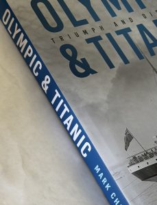The title of the book, Olympic & Titanic: Triumph and Disaster, is intended to draw the contrast between the first two of the three ‘Olympic‘ class ships. A theme throughout is how similar these ships were from a design perspective and how their stories diverged so significantly. It seemed appropriate that Olympic should be on the front cover, as the more successful of the two. We see her depicted in a wonderful, sharp photograph as she sets out for New York. Everything portends a long, successful career which is exactly what lay ahead of her.